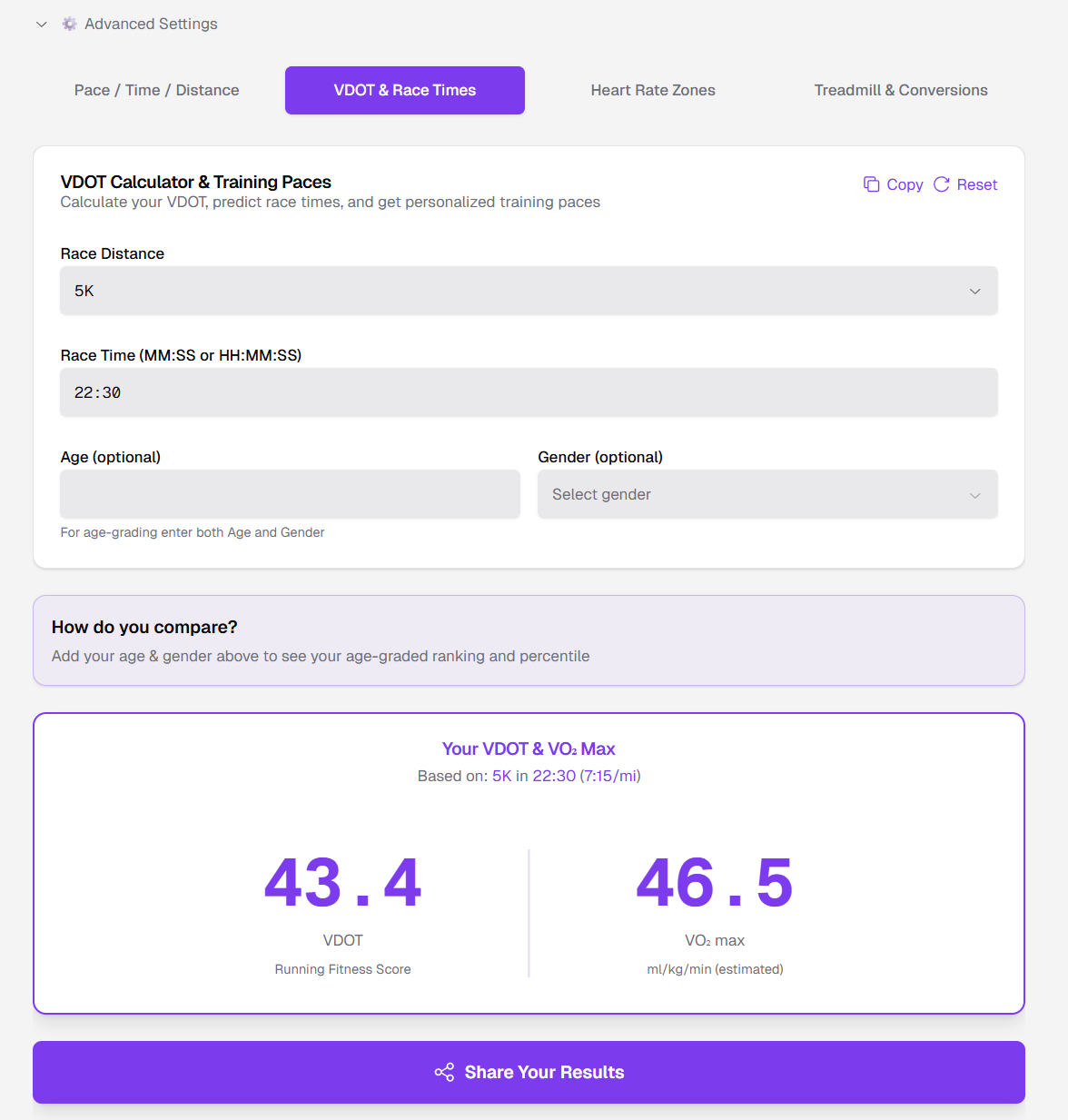 Compare your VDOT with other runners. Filter by age group and gender to find your ranking.